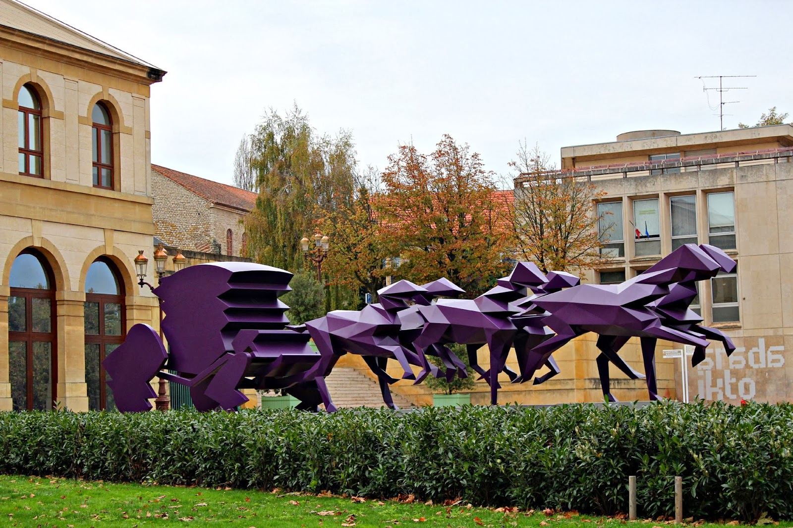 The Temple de Metz is a historic Protestant church. As it was closed that day, I'll remember it better for the eye-catching color combination of the gray stone, purple metal fence accents, and lime green moss on its walls. Not to mention the drunk tree.
